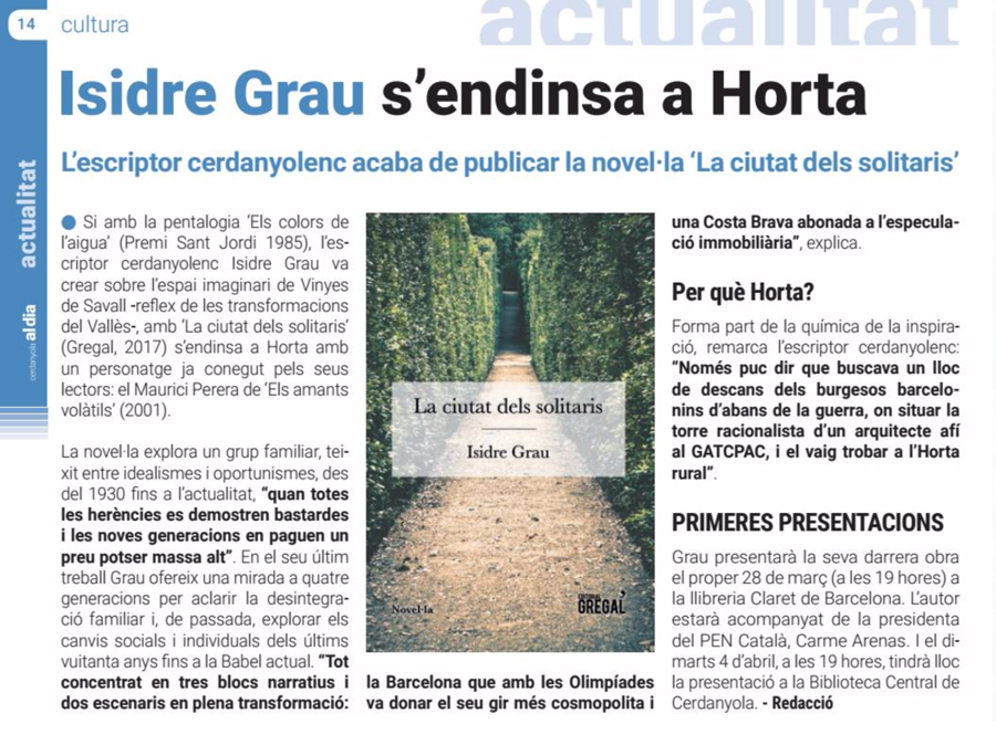 Si amb la pentalogia “Els colors de l’aigua” (Premi Sant Jordi 1985), l’escriptor cerdanyolenc Isidre Grau va crear sobre l’espai imaginari de Vinyes de Savall -reflex de les transformacions del Vallès-, amb “La ciutat dels solitaris” s’endinsa a Horta amb un personatge ja conegut pels seus lectors: el Maurici Perera de “Els amants volàtils” (2001).
