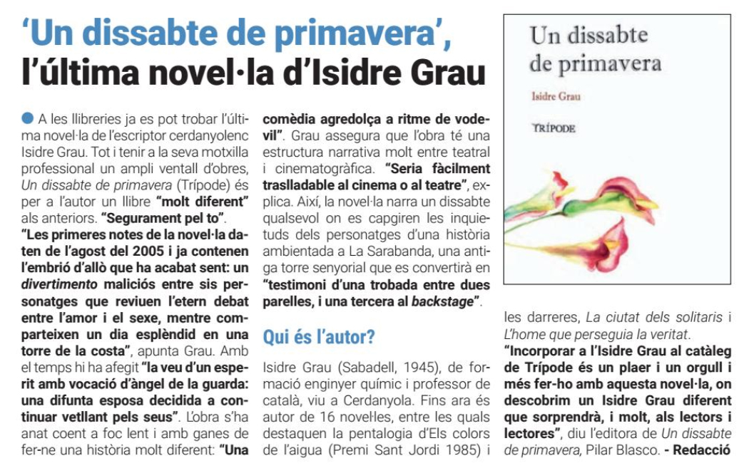 A les llibreries ja es pot trobar l’última novel·la de l’escriptor cerdanyolenc Isidre Grau. Tot i tenir a la seva motxilla professional un ampli ventall d’obres, Un dissabte de primavera (Trípode) és per a l’autor un llibre “molt diferent” dels anteriors.